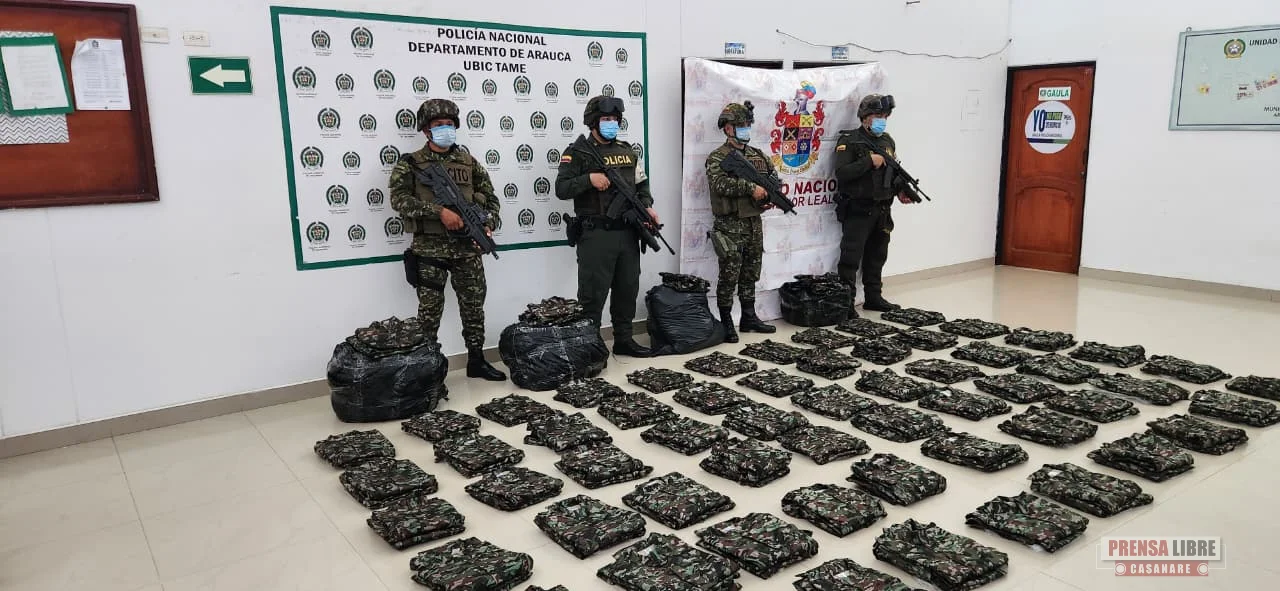 Durante estas inspecciones se detectó un envío proveniente de Bogotá con destino a Tame, el cual contenía 120 uniformes tipo camaleón sin serial, fabricados en tela Lafayette, presuntamente destinados a los grupos armados residuales (GAO-r) en Arauca.