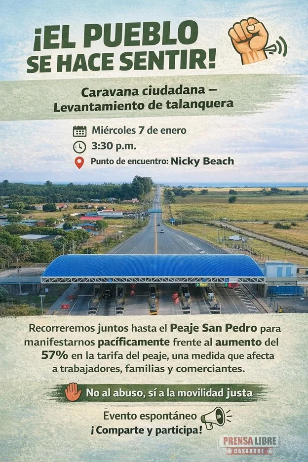 Una caravana ciudadana fue convocada para este miércoles con el propósito de manifestarse de manera pacífica en contra del aumento del 57 % en la tarifa del peaje San Pedro, una medida que, según los organizadores, impacta directamente a trabajadores, familias y comerciantes de la región.