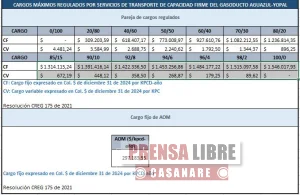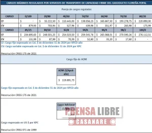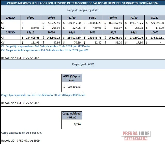 COINOGAS S.A. E.S.P informa a todos los agentes del mercado de gas, que las tarifas para las parejas de cargos temporales del gasoducto Floreña - Yopal y Aguazul - Yopal para el mes de DICIEMBRE hasta DICIEMBRE de 2025 son las siguientes: