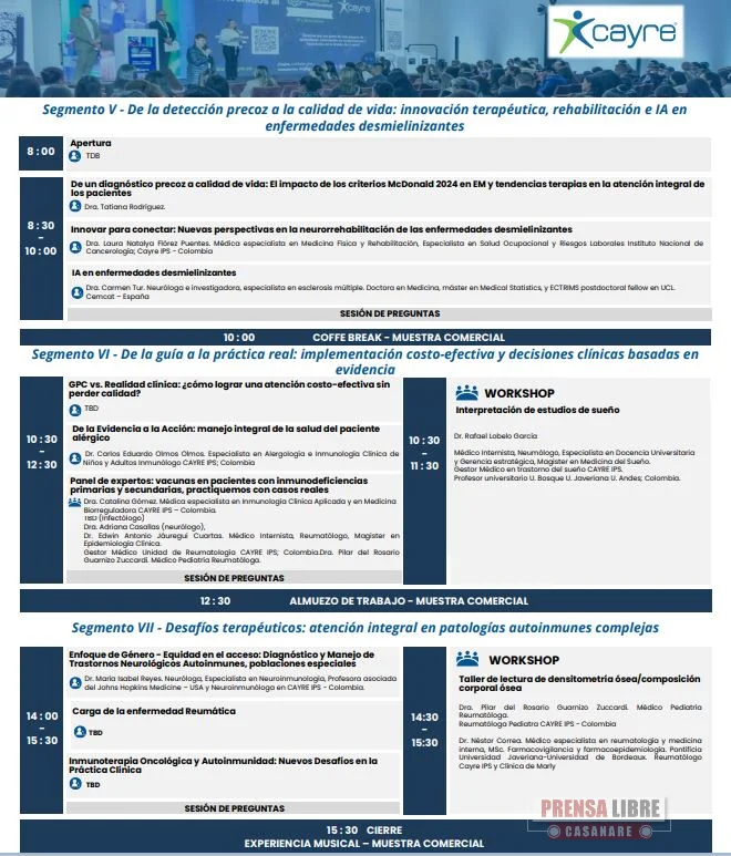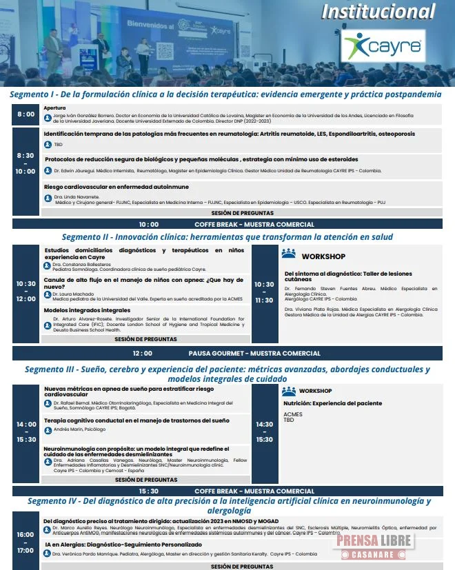 Durante dos jornadas, la agenda abordará: Reumatología y autoinmunidad: diagnóstico temprano (artritis reumatoide, LES, espondiloartritis y osteoporosis), reducción segura de biológicos y riesgo cardiovascular. Inteligencia artificial en salud: apoyo a la toma de decisiones clínicas, predicción de adherencia, IA en diagnóstico y seguimiento en alergología, y realidad aumentada para ajuste de máscaras PAP.
