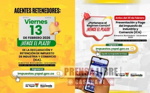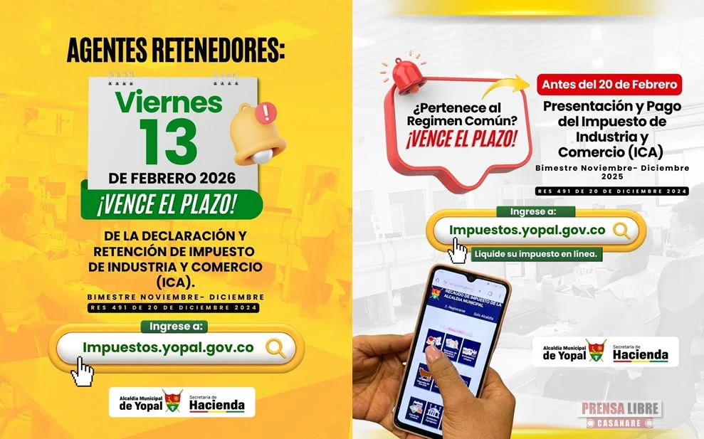 Igualmente, la Alcaldía de Yopal recordó que los Agentes Retenedores tienen plazo hasta el 13 de febrero para declarar y pagar el Impuesto de Industria y Comercio ICA correspondiente al bimestre noviembre - diciembre, último periodo gravable del año 2025.