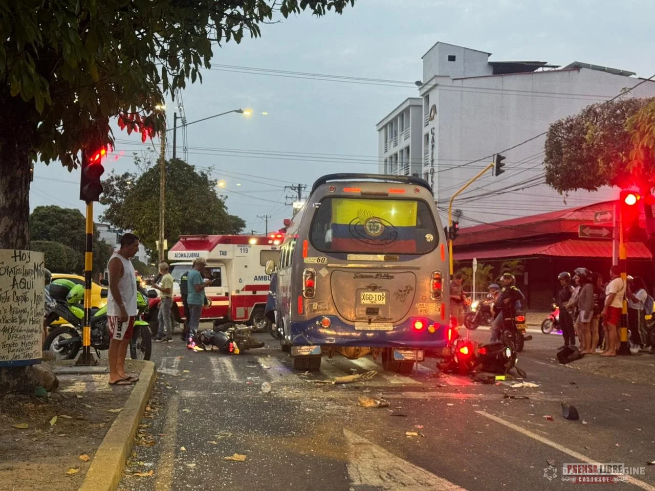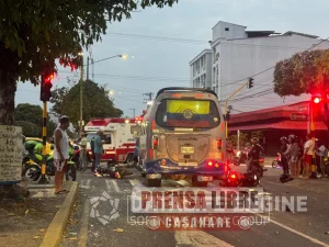 Tres personas resultaron lesionadas, una de ellas de gravedad, tras un fuerte choque múltiple registrado en la calle 24 con carrera 14 de Yopal. En el siniestro se vieron involucradas una buseta de servicio público de placa IGD 109, tres motocicletas y una camioneta Toyota.