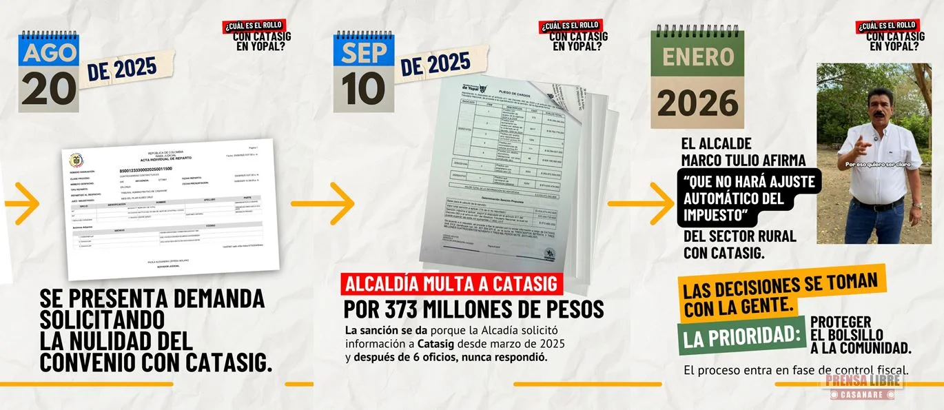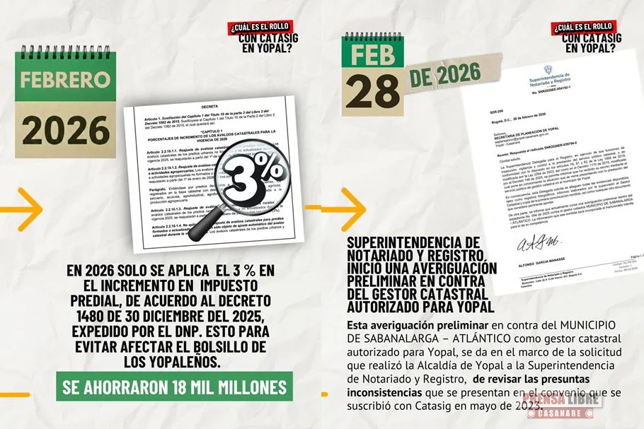 La Alcaldía de Yopal mantiene la facturación suspendida hasta que existan garantías técnicas y jurídicas suficientes. El objetivo es que los yopaleños cumplan con su obligación tributaria sobre bases ciertas, verificadas y ajustadas a la ley, accediendo a los beneficios tributarios por pago oportuno, cuya primera fecha (15 al 30 % de descuento) está dispuesta para el 31 de marzo de 2026.