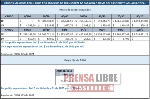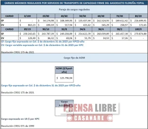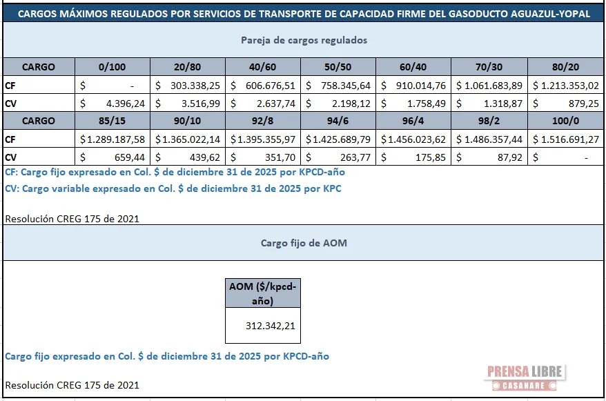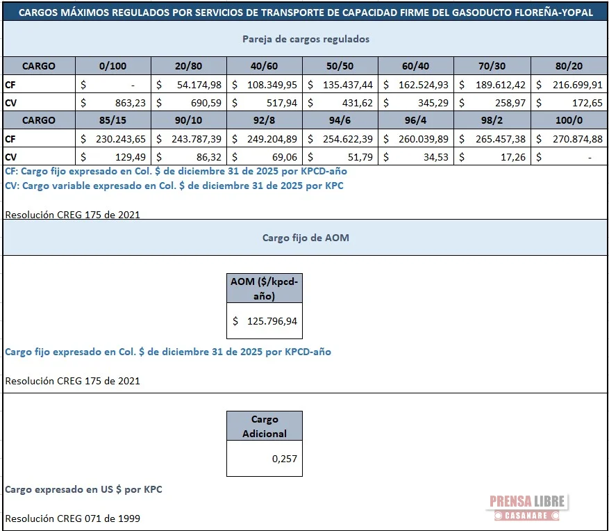 COINOGAS S.A. E.S.P informa a todos los agentes del mercado de gas, que las tarifas para las parejas de cargos temporales del gasoducto Floreña-Yopal y Aguazul-Yopal para el mes de ABRIL del 2026 son las siguientes: