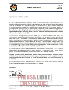 El Cuerpo de Bomberos Voluntarios de Yopal aclaró que, tras la atención de una persona accidentada en la carrera primera en inmediaciones a Torres del Silencio, acudió al llamado realizado por la comunidad con una unidad de ambulancia que se desplazó oportunamente al lugar, donde se encontró a un ciudadano, en posición bocabajo, con visibles lesiones y sangrado en el rostro, rodeado por varias personas.