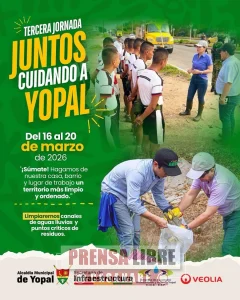 La actividad, denominada “Juntos Cuidando a Yopal”, se desarrolla por tercer año consecutivo y contará con el apoyo de Veolia y la Empresa de Acueducto, Alcantarillado y Aseo de Yopal (EAAAY), además de la participación de entidades públicas, organismos de socorro, fuerzas militares y líderes comunitarios.