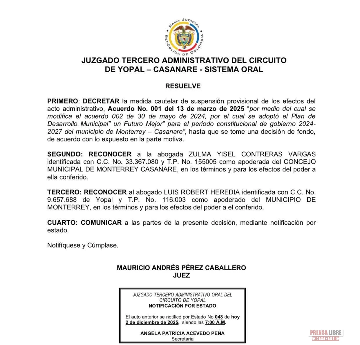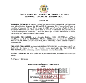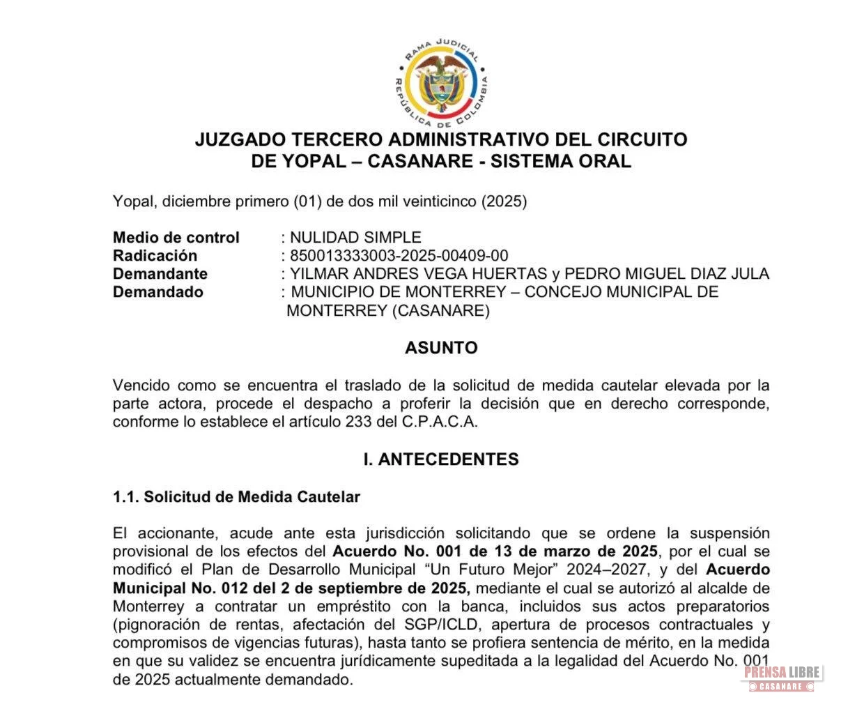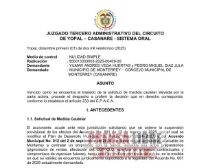 El Juzgado Tercero Administrativo del Circuito de Yopal decretó medidas cautelares dentro de un proceso de nulidad simple, dejando en suspensión provisional el endeudamiento del municipio de Monterrey. La decisión afecta directamente el Acuerdo Municipal 001 de 2025, mediante el cual se modificó el Plan de Desarrollo “Un Futuro Mejor” e introdujo una nueva fuente de financiación a través de empréstitos.