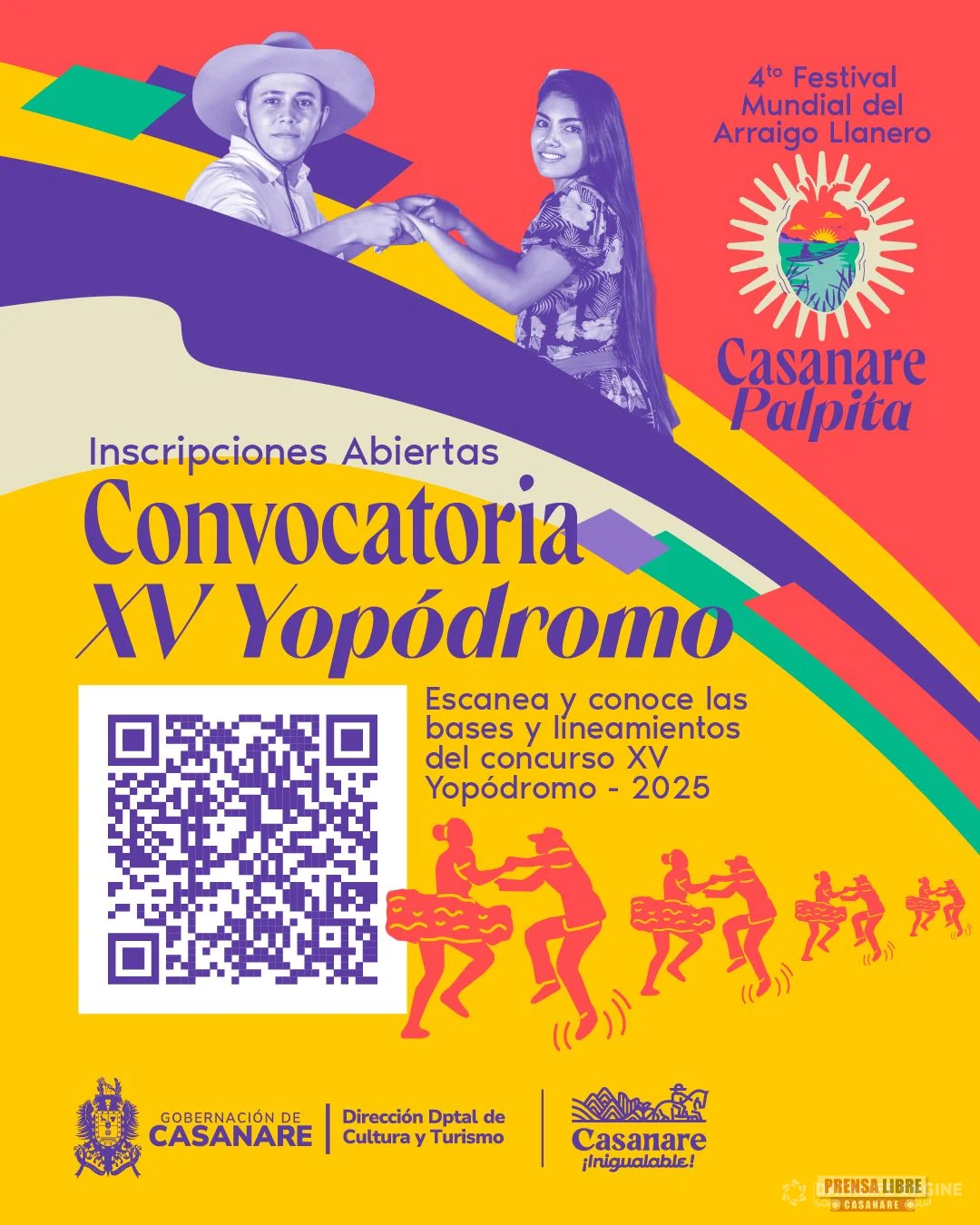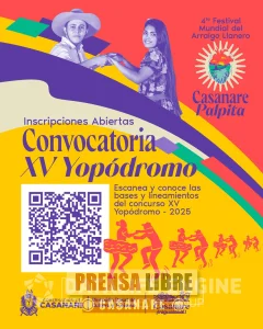 La funcionaria informó que se encuentra abierta la convocatoria del XV Yopódromo, uno de los eventos insignia del festival. Los interesados podrán realizar su inscripción en los canales oficiales de la Gobernación de Casanare y de la Dirección de Cultura y Turismo. La fecha límite de inscripción es el 17 de diciembre de 2025. Para más información y formulario de inscripción se puede consultar este enlace oficial: https://drive.google.com/file/d/10aZAUaz1N7OEP4VsiGKn0TNYA_0-lifh/view?usp=drivesdk