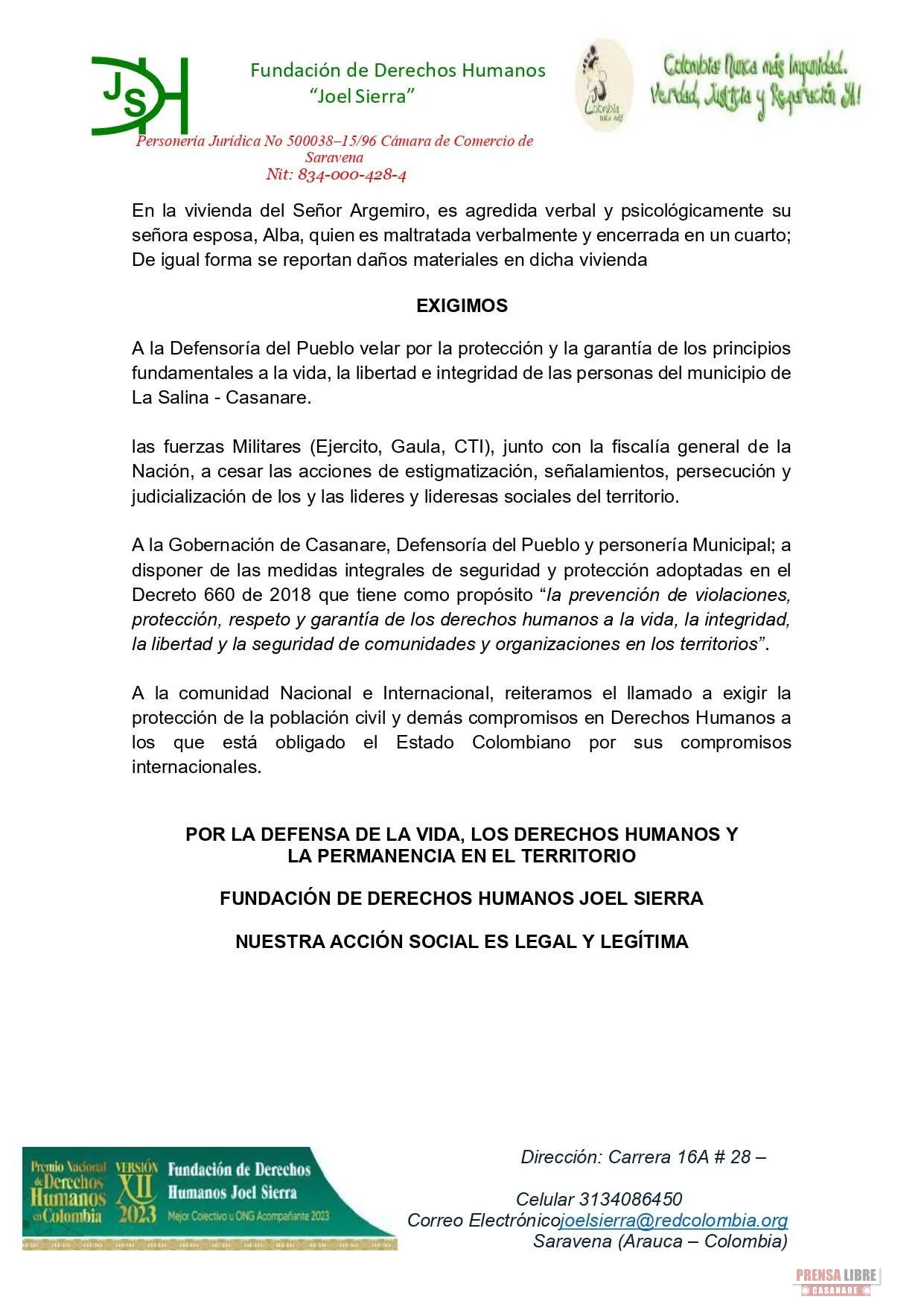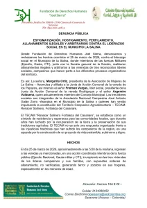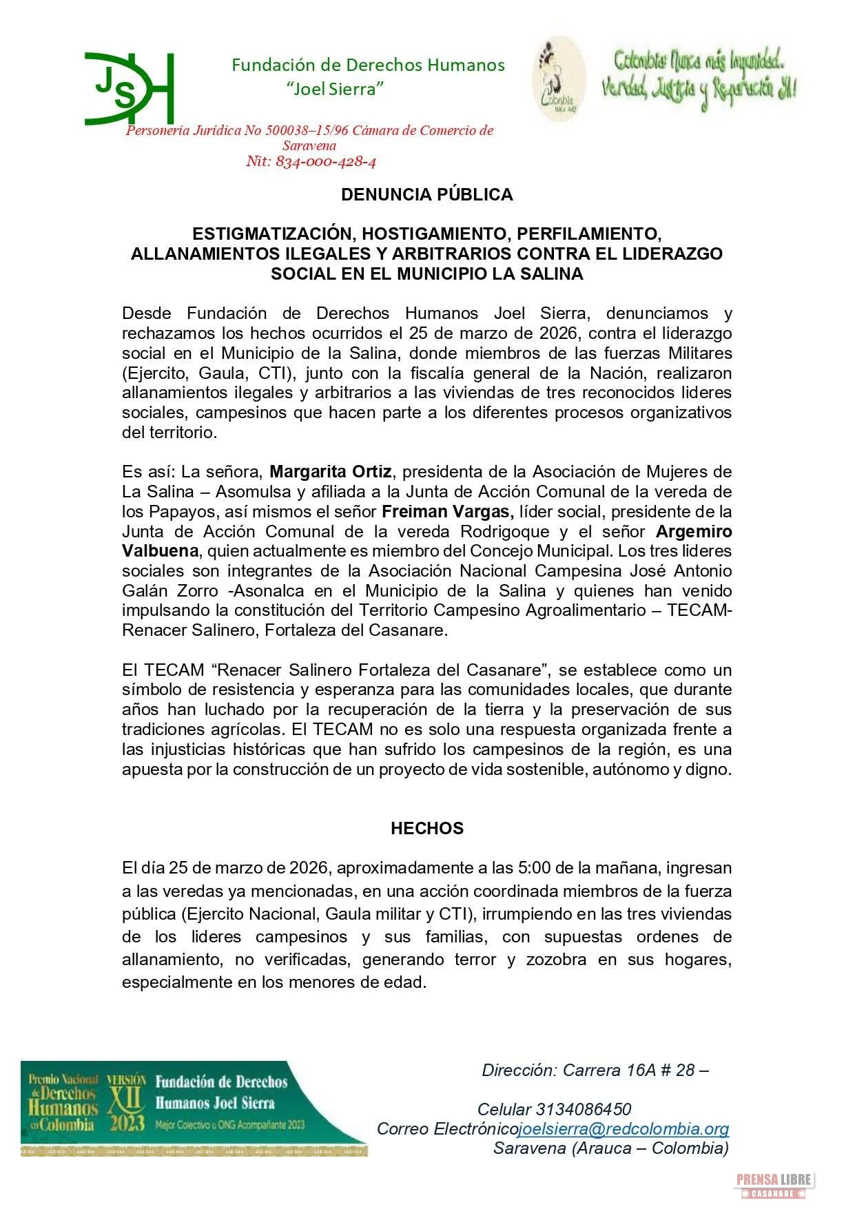 La Fundación de Derechos Humanos Joel Sierra denunció públicamente presuntos casos de estigmatización, hostigamiento, perfilamiento y allanamientos ilegales contra líderes sociales en el municipio de La Salina, al norte del departamento de Casanare.