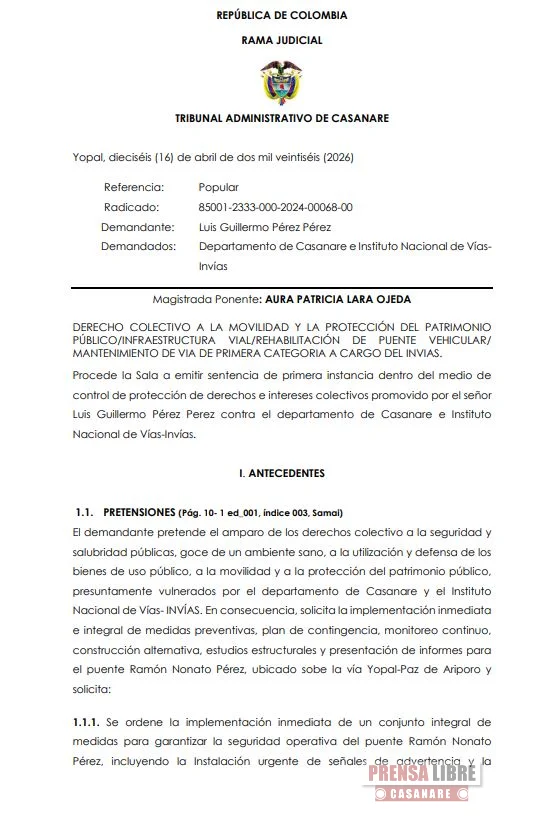 El Tribunal Administrativo de Casanare ordenó al Instituto Nacional de Vías (Invías) ejecutar de manera urgente un plan integral para la rehabilitación del puente Ramón Nonato Pérez, ubicado en la vía Yopal – Paz de Ariporo, tras evidenciar la vulneración de derechos colectivos como la seguridad pública, la movilidad y la protección del patrimonio público.