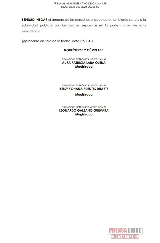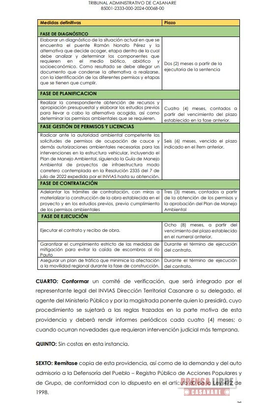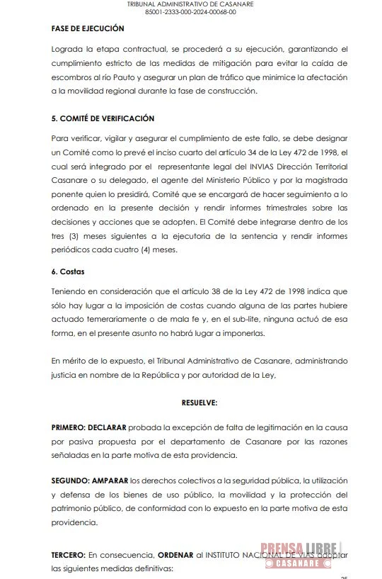 En el fallo también se determinó que el departamento de Casanare no es responsable directo de la situación, ya que el mantenimiento de esta infraestructura corresponde exclusivamente a Invías, al tratarse de una vía nacional. Sin embargo, se evidenció que la entidad no ha adelantado las acciones necesarias para una rehabilitación completa, pese a contar con estudios técnicos que advierten la gravedad del problema.