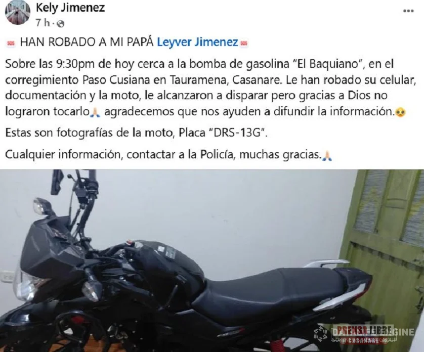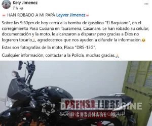 De acuerdo con la denuncia pública realizada por la artista, el hecho ocurrió hacia las 9:30 de la noche de este lunes 20 de abril en inmediaciones de estación de servicio “El Baquiano”, en el corregimiento Paso Cusiana. La víctima, identificada como Leyver Jiménez, fue interceptada por delincuentes que le hurtaron su motocicleta, celular y documentos personales.